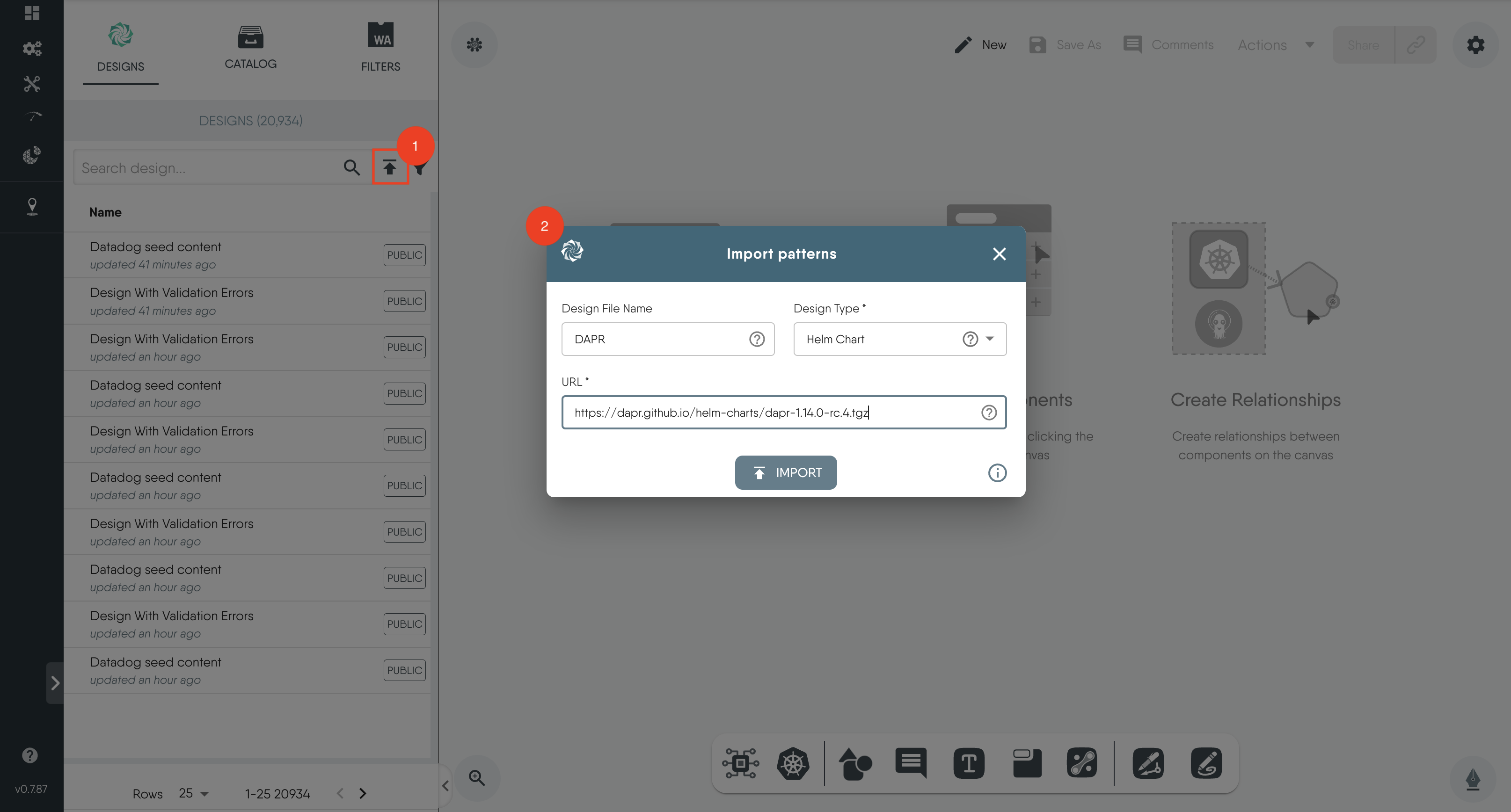3. On the Designs tab on the left, click on the DAPR design you just imported. This will display the various Kubernetes resource components required for deploying the Dapr control plane on the canvas.